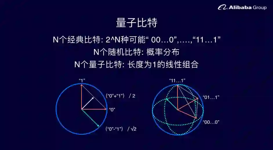 N个经典比特有2的N次方种可能;N个随机比特是2的N次方个可能的概率分布;N个量子比特是这些经典状态的长度为1的线性组合。