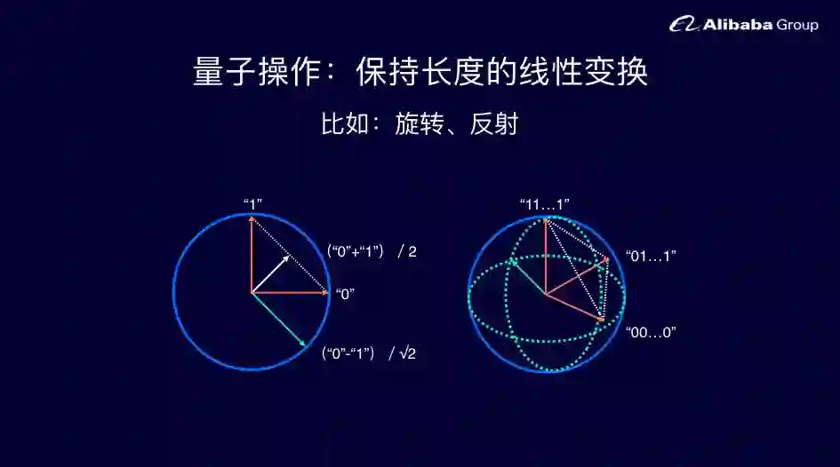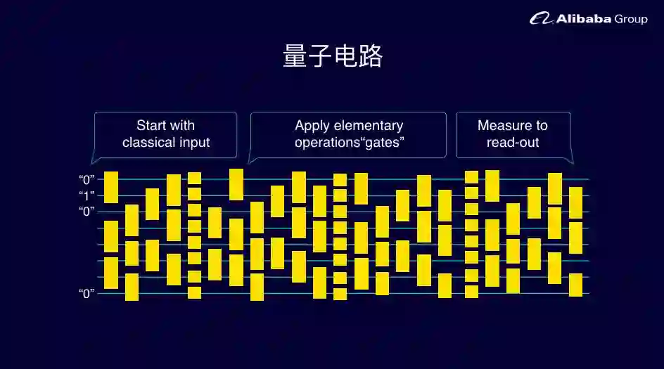 图中每条线对应一个量子比特,初始化为经典的0、1输入,接着我们会选择某几个量子比特去做对应的线性空间上面的保持长度的线性变换。这就是一个基本的“量子门”(quantum gate)。