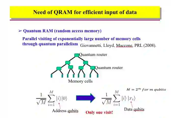 如果量子RAM(random access memory)可以实现,能够将大数据转化输入成量子态,从而在提取的过程中要实现指数加速,实现并行量子访问。