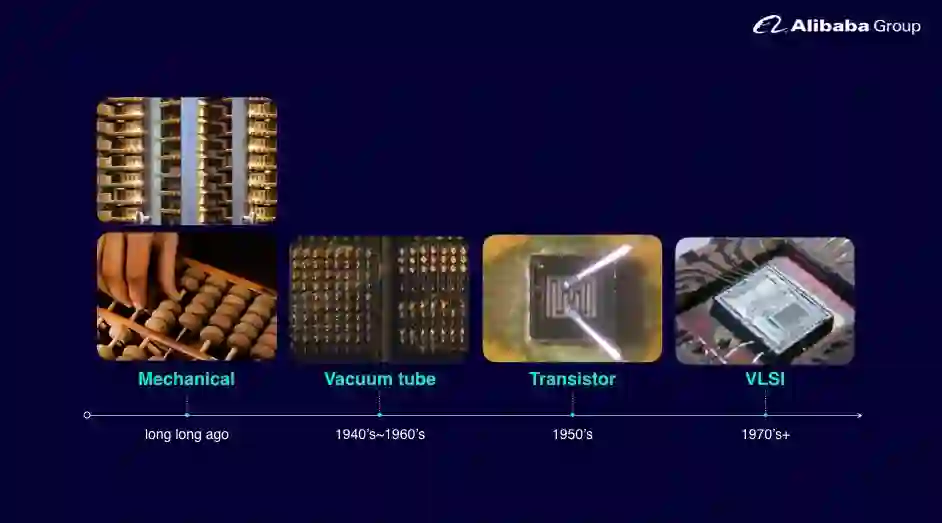 我们的祖先发明最早的计算(器)——算盘,到上世纪40-60年代,出现基于Vacuum tube的计算机,50年代出现了Transistor,现在的技术是基于在70年代出现的VLSI。