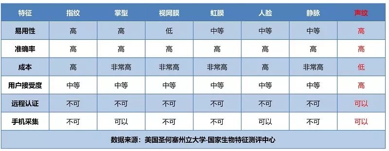 从易用性、准确率、成本、用户接受度等角度出发,对各项生物识别技术做对比。我们可以直观看到,综合评判上,相比于指纹识别、掌型识别、人脸识别、虹膜识别等生物识别技术,声纹识别在各方面都占据优势。