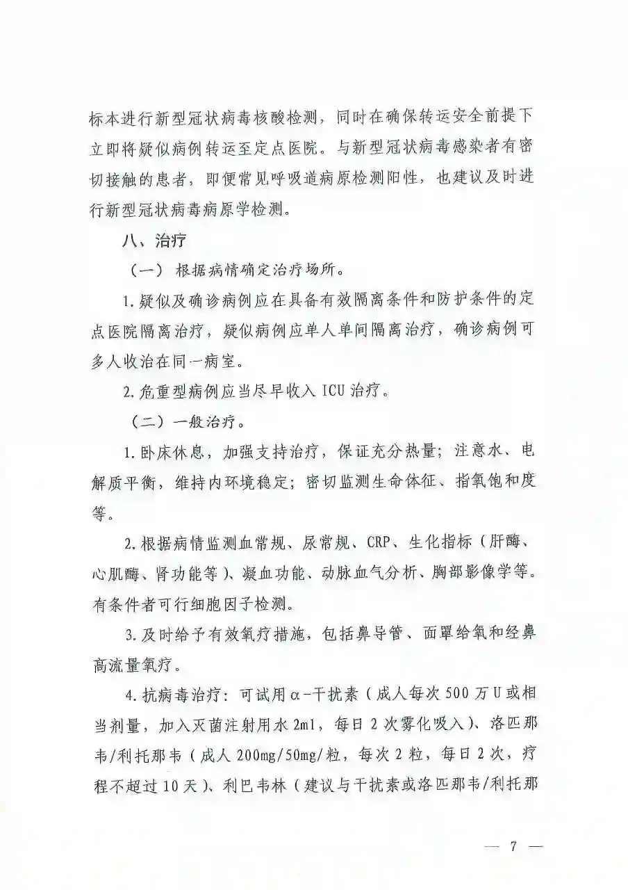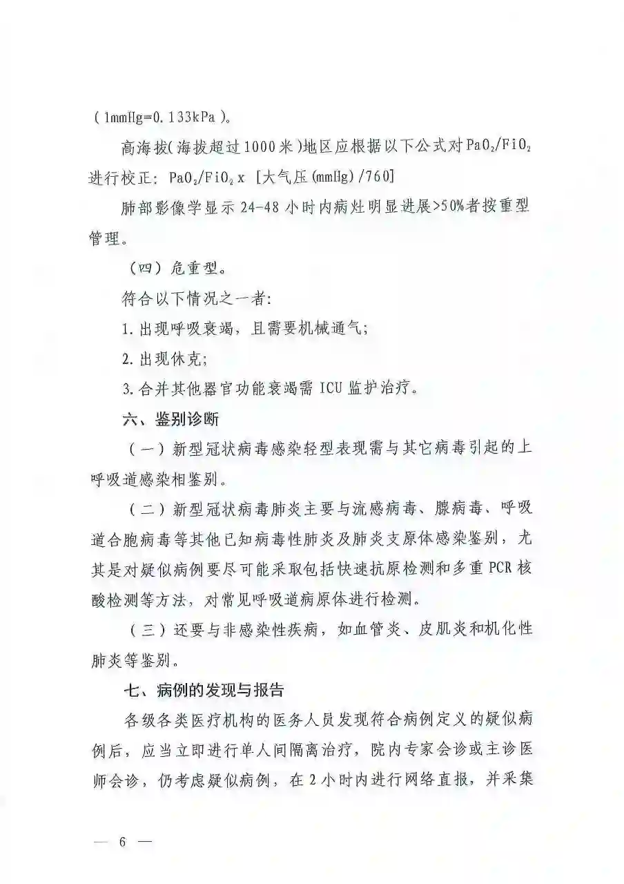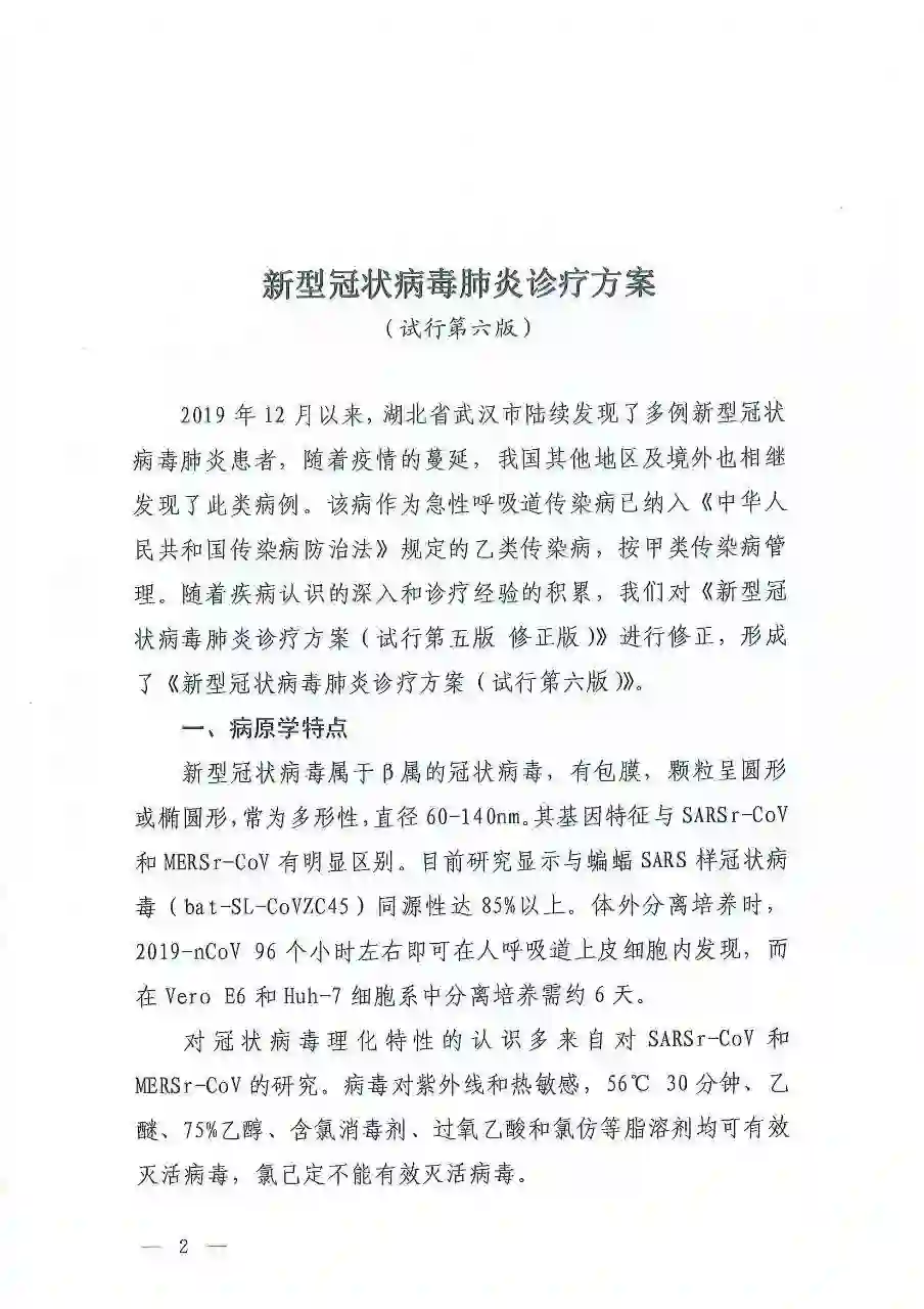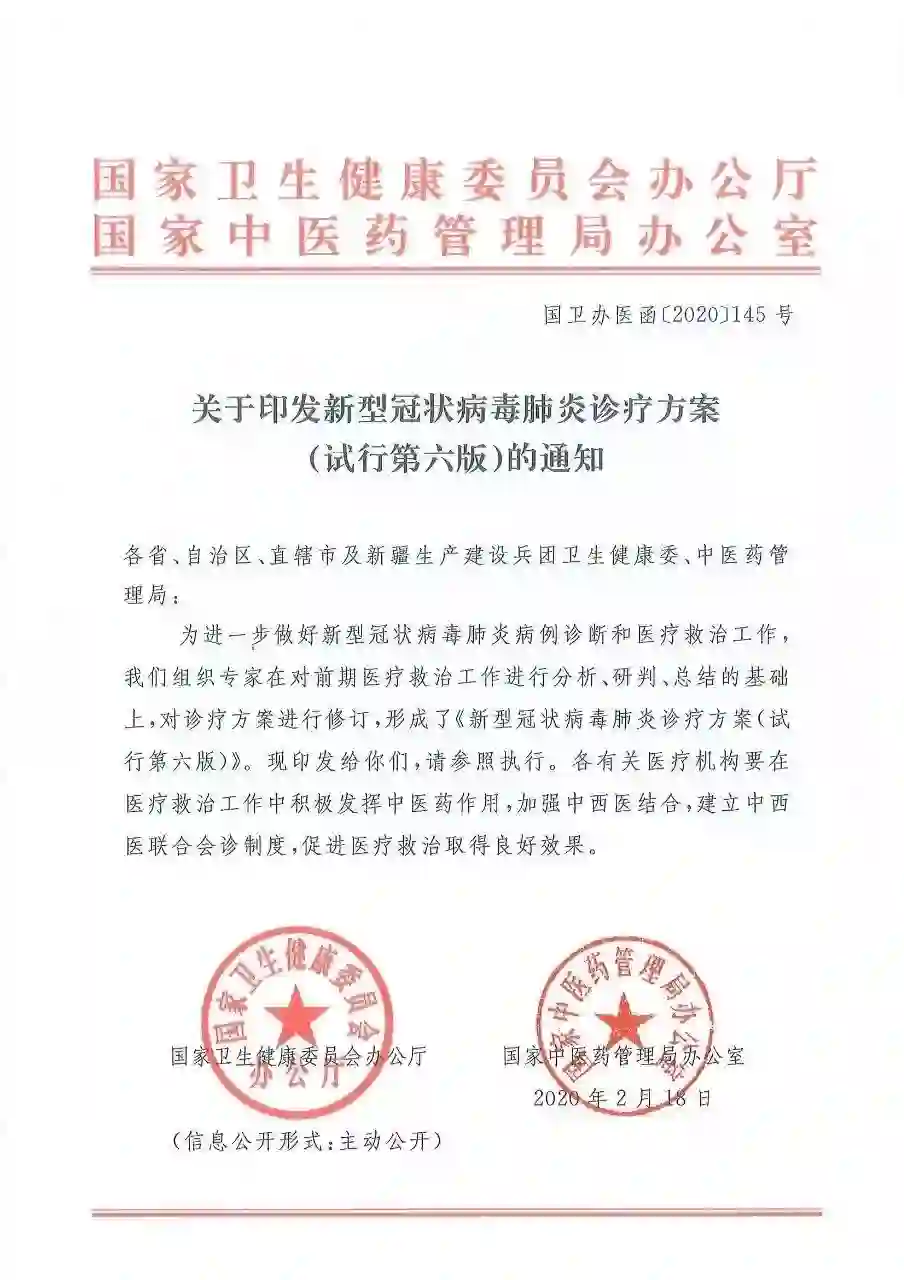 2020年2月18日,国家卫健委办公厅发布《关于印发新型冠状病毒感染的肺炎诊疗方案(试行第六版)》。相比第五版,第六版的诊疗方案中增加了更详细的鉴别诊断内容,在治疗方面亦积累了大量的临床救治经验,抗病毒的药物有所增加,强化了多器官功能损失的对症支持治疗,修订了中医药治疗的方案,此外还增加了血浆的治疗方法。