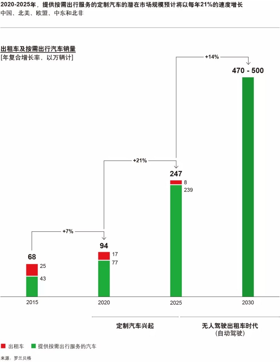 罗兰贝格最近发布的报告预计,到2020 年,用于新型出行服务的车辆将占总新车销售的13%,一个新的细分市场即将出现,即提供按需出行服务的新一代定制汽车。欧洲、美国和中国的定制网约车和出租车的年销量到2020年预计可达到100万辆,到2025年将增至250万辆。