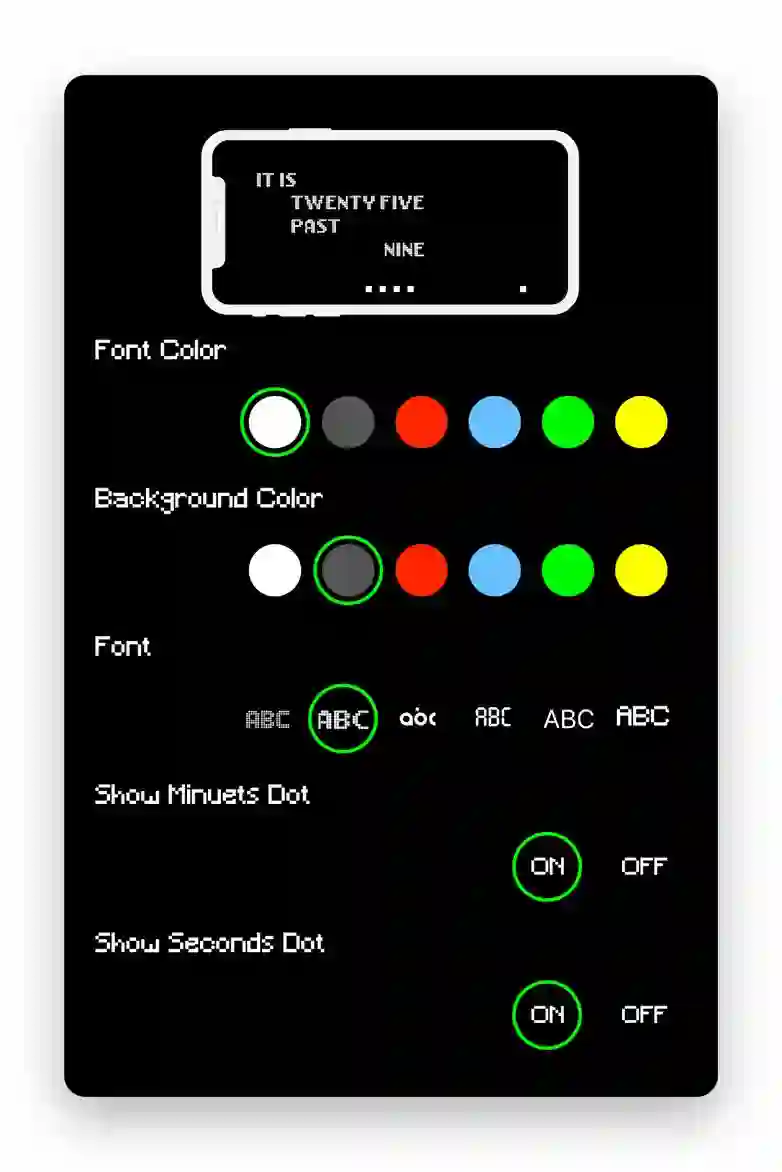 当我们轻按屏幕后,左下角便会出现一个白点,点击即可进入设置界面。在设置里,你可以修改文字的字体、颜色及背景颜色,或是开关 Minutes Dot 与 Seconds Dot。