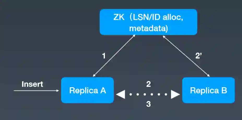 为了解决问题,团队基于 MergeTree 存储引擎开发了一套自己的高可用方案,思路就是把更多 ZK 上的信息卸载下来,ZK 只作为 coordinate Service。只让它做三件简单的事情:行为日志的 Sequence Number 分配、Block ID 的分配和数据的元信息,这样就能保证数据和行为在全局内是唯一的。