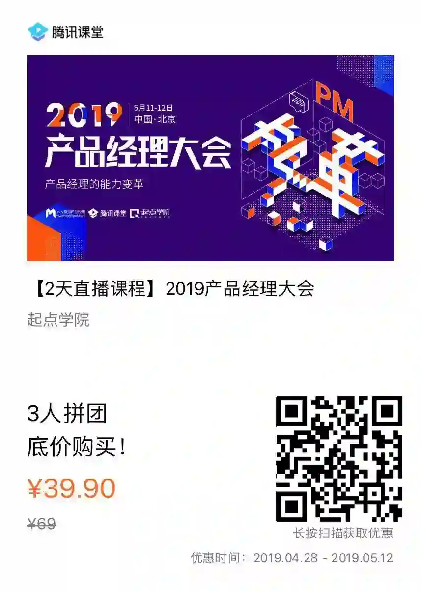 腾讯课堂作为本次大会的独家直播支持平台,推出限时拼团福利啦,3人成团仅需39.9元/人哟!