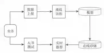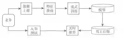 如下图所示, 一个典型的基于离线训练的推荐系统架构由数据上报、离线训练、在线存储、实时计算和 A/B 测试这几个模块组成。其中,数据上报和离线训练组成了监督学习中的学习系统,而实时计算和 A/B 测试组成了预测系统。另外,除了模型之外,还有一个在线存储模块,用于存储模型和模型需要的特征信息供实时计算模块调用。图中的各个模块组成了训练和预测两条数据流,训练的数据流搜集业务的数据最后生成模型存储于在线存储模块;预测的数据流接受业务的预测请求,通过 A/B 测试模块访问实时计算模块获取预测结果。