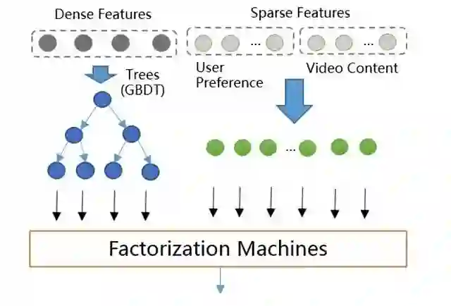 GBDT是不支持高维稀疏特征的,如果将高维特征加到LR中,一方面需要人工组合高维特征,另一方面模型维度和计算复杂度会是O(N^2)级别的增长。所以设计了GBDT+FM的模型如图所示,采用Factorization Machines模型替换LR。