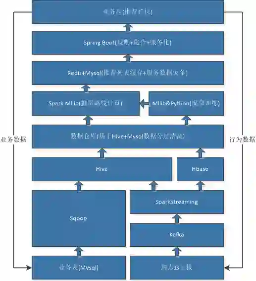下图是与之对应的实际系统中各个组件的流转过程。需要注意的是生成推荐列表就已经做完了召回和排序的操作,业务层直接调用API就可以得到这个推荐列表。