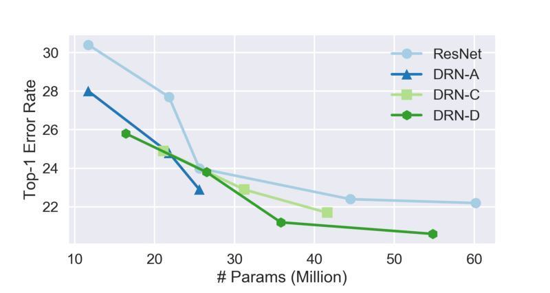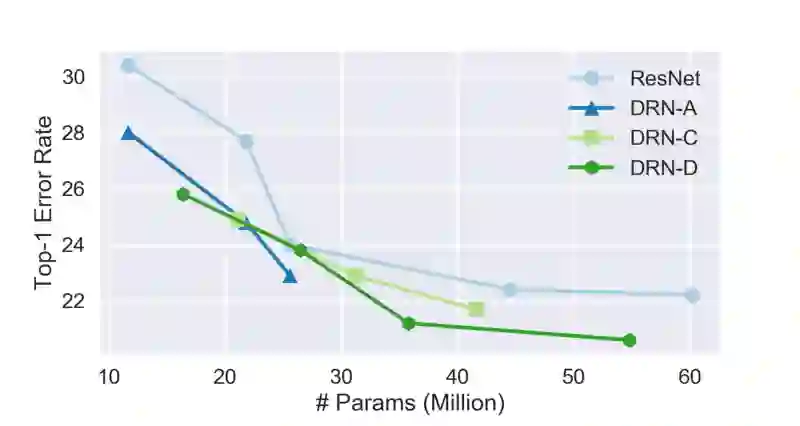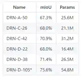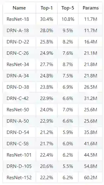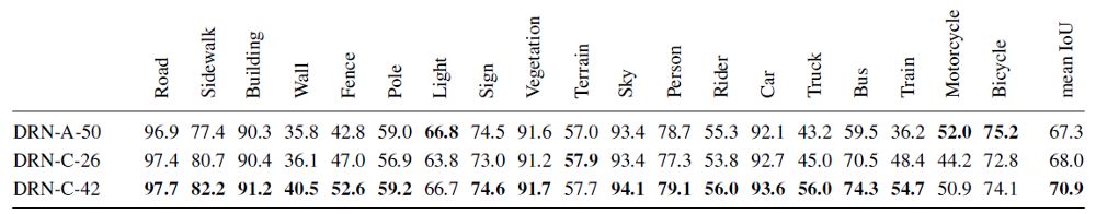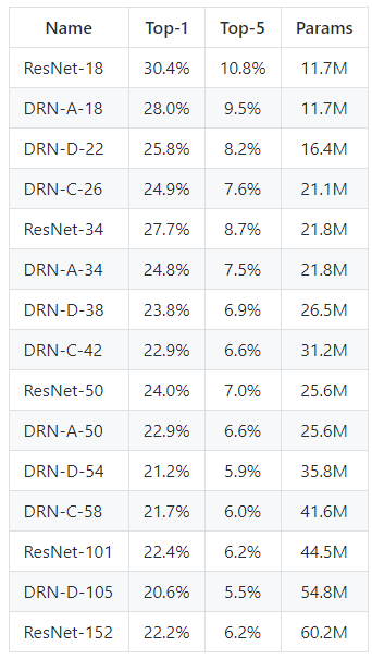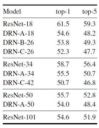 DRN-C-26的表现比ResNet-101基准模型高出一个多百分点,尽管ResNet-101的网络层数是 DRN-C-26的4倍。