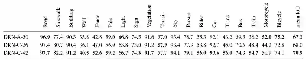 DRN-C-26和DRN-C-42的表现都优于DRN-A-50,这表明去网格化结构对密集预测任务特别有利。