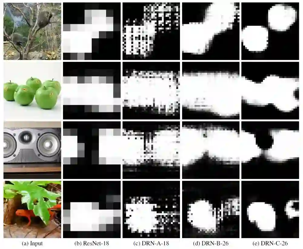 DRN-C-26的性能明显优于DRN-A-50,尽管深度要低得多。这表明,去网格化方案对于需要更详细的空间图像分析的应用程序具有特别显著的好处。