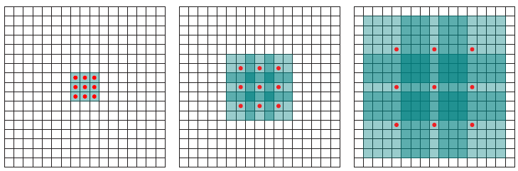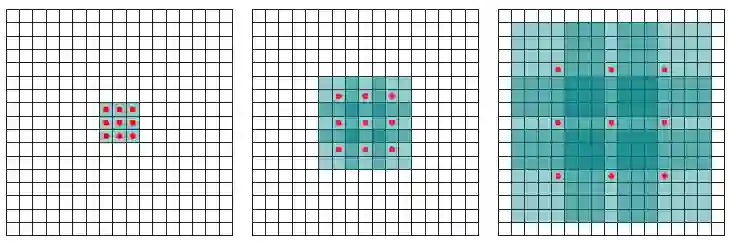 标准卷积(l=1)(左),扩张卷积(l=2)(右)