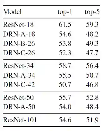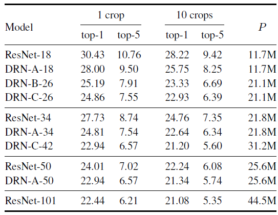 DRN-A-18和DRN-A-34的1-crop top-1准确率分别比ResNet-18和ResNet-34高2.43和2.92个百分点。(从ResNet-34到DRN-A-34,相对误差降低了10.5%。)