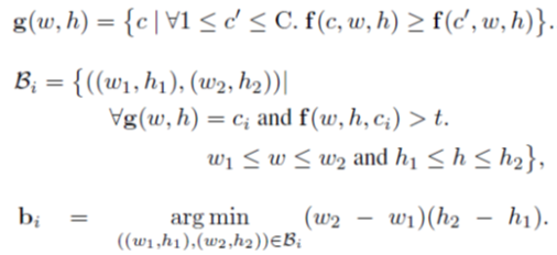 在分辨率为W×H的C响应map中,f(C, W, H)为位置(W, H)的响应,每个位置的最可能的类别为g(W, H),边界框集合为Bi,其中t为激活阈值。bi为在Bi中选择的最小边界框。