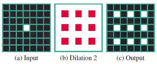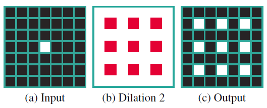 上面的例子说明了l=2时的卷积过程。我们可以看到感知野比标准卷积大。