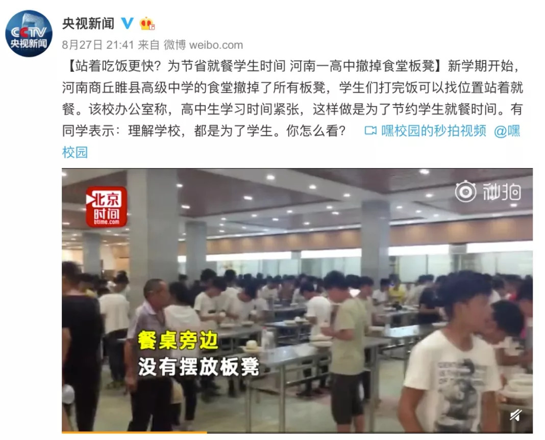 最近,某中学在网上突然火了,只因该校食堂将板凳全部撤去,学生只能站着吃饭。据说这是为了提高学生就餐的效率,10分钟就可以解决吃饭问题,节约时间好去学习。