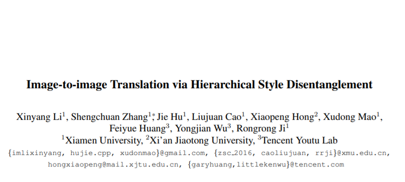 该论文由信息学院计算机系2019级硕士李新阳,张声传助理教授(通讯作者),2019级博士胡杰,曹刘娟副教授,西安交通大学教授洪晓鹏,毛旭东副教授,纪荣嵘教授和腾讯优图实验室等合作完成。本文提出了一种层级风格解耦的办法,来解决图像到图像翻译领域多样性不可控的问题。其中,原本的标注被组织成为自顶向下依次是独立标签,互斥属性和解耦风格的层次结构。论文为此重新设计了相应的结构模块和翻译流程。在人脸属性编辑的定性定量比较中均获得了最先进的效果。代码已经开源。