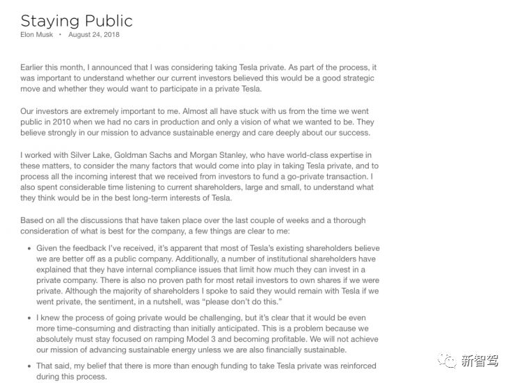 在宣布“考虑特斯拉私有化”的18天时间后,马斯克今天亲自发公开信表示:放弃私有化。在今天的公开信当中,马斯克也表示大多数的股东认为特斯拉作为上市公司将会更加好。此外,马斯克也坦诚承认私有化的过程非常具有挑战性,比最初预想的更耗费时间和精力。