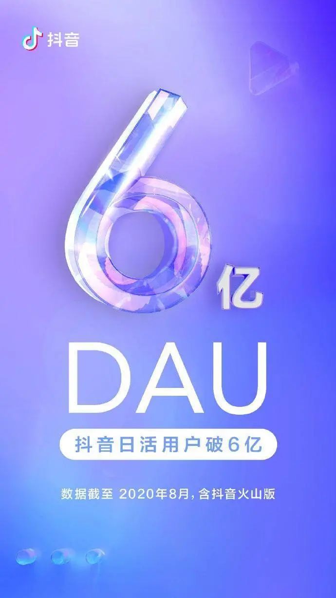 抖音官方公布的数据显示,截至 2020 年 8 月,包含抖音火山版在内,抖音日活跃用户已超 6 亿。
