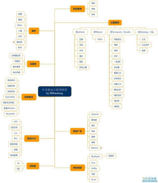 (这张图是早年在移动广告聚合平台果合工作,现在是触控 COO 的好朋友悟空,在当时很棒的个人科技博客---天涯海阁上发布的移动互联网图谱。今天回头看这样一张图可能大家会觉得有些搞笑,但那时候市面上听过名字的项目也就是这些了。)