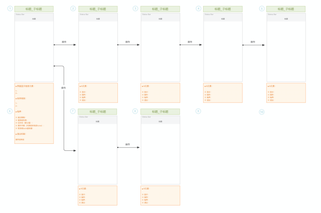 这种展示方式需要将一个任务拆解为简短的若干子流程,将子流程按照一定的顺序(一般从左至右,从上到下)画在一页交互稿上,确保每一页交互稿都是点状或线状的,避免界面、引导线和交互说明过多过密而造成很难阅读。