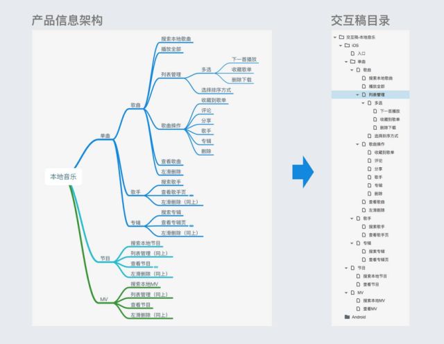 以下图的网易云音乐的本地音乐模块为例,可以看出模块的信息结构与其交互稿一一对应,这种文档结构非常清晰易懂。