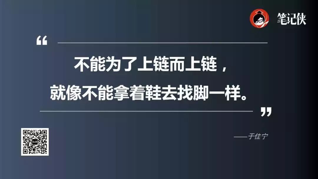所以,区块链一定要跟传统产业的需求找到结合点,不能为了上链而上链,就像我们不能拿一双鞋去到处找脚的道理一样。