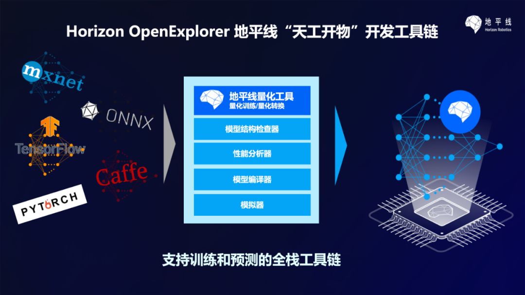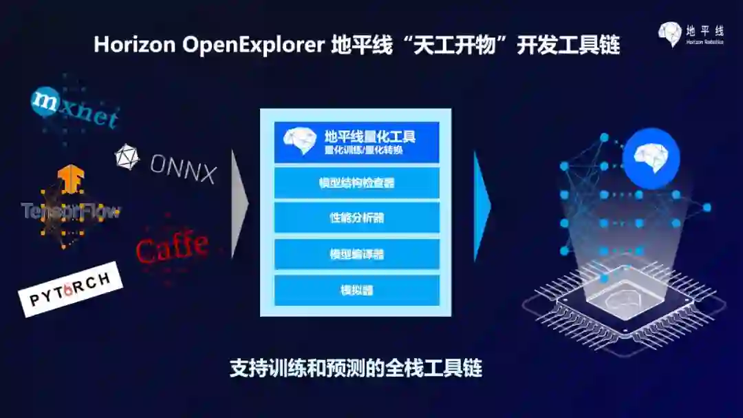 伴随征程二代芯片正式量产,地平线 AI 芯片工具链 Horizon OpenExplorer(地平线“天工开物”)也正式亮相。Horizon OpenExplorer 包含面向实际场景进行 AI 算法和应用开发的全套工具。模型训练工具、检查验证工具、编译器、模拟器、嵌入式开发包等悉数亮相,工具链中还有参考模型样例、参考整体软件方案支持客户快速产品落地。