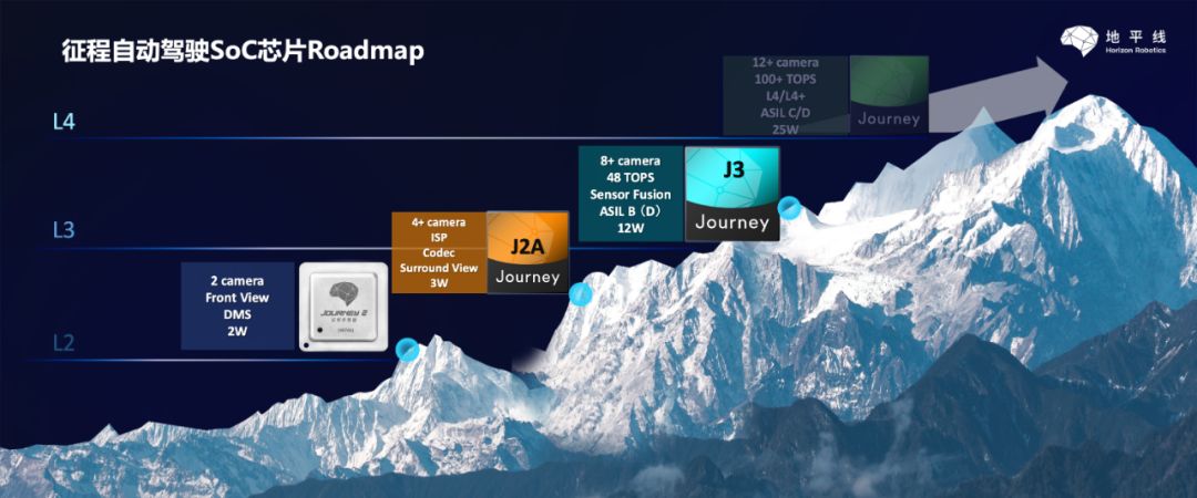 此外,征程三代之后的下一代 SoC 芯片也规划中,预计将采用更先进的 7 纳米工艺。主要应用场景为 L4 以及更高级别的自动驾驶,可支持最多 12 路视频输入,算力高达 100+TOPS,而功耗仅为 25W 左右。围绕能效比这一核心点,地平线车规级 AI 芯片正努力跨过一座座山峰,最终实现攀登珠穆朗玛峰的目标。