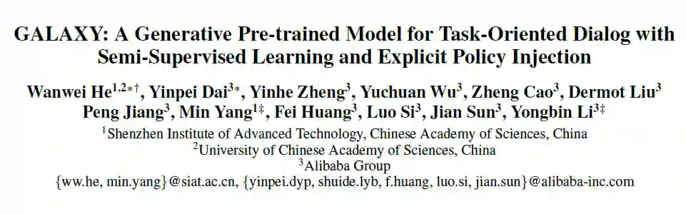 [5] He W, Dai Y, Zheng Y, et al. GALAXY: A Generative Pre-trained Model for Task-Oriented Dialog with Semi-Supervised Learning and Explicit Policy Injection[J]. arXiv preprint arXiv:2111.14592, 2021.