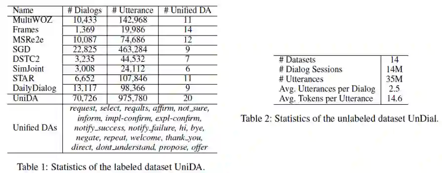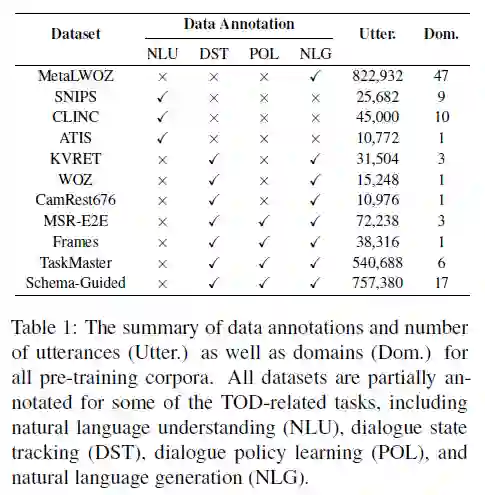 数据集:本文使用 11 个部分标注的任务型对话数据集对模型进行预训练,总共 2.3M 句话语,包含 80 个领域。数据集及其标注信息如下表所示。