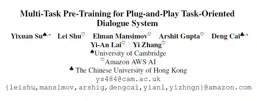 [4] Su Y, Shu L, Mansimov E, et al. Multi-Task Pre-Training for Plug-and-Play Task-Oriented Dialogue System[J]. arXiv preprint arXiv:2109.14739, 2021.