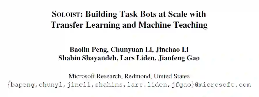 [3] Peng B, Li C, Li J, et al. Soloist: Building task bots at scale with transfer learning and machine teaching[J]. Transactions of the Association for Computational Linguistics, 2021, 9: 807-824.