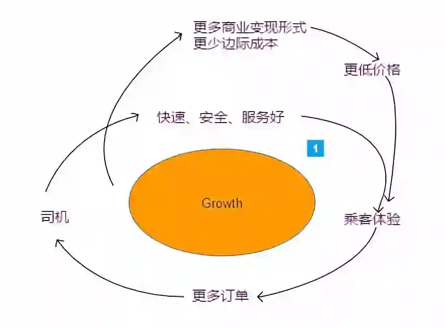 滴滴在现在面临困境下如何增长的问题,套用Netflix的增长飞轮模型,笔者以为滴滴理想的增长飞轮应该是下面所示那样: