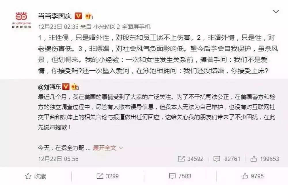 刘强东就不必说了。虽然美国警方“不起诉”,但他也承认事情是真的,只不过他认为是双方自愿,对方认为是强迫的。即使越过受害人的问题,此举,置此前天天晒恩爱的妻子于何地?