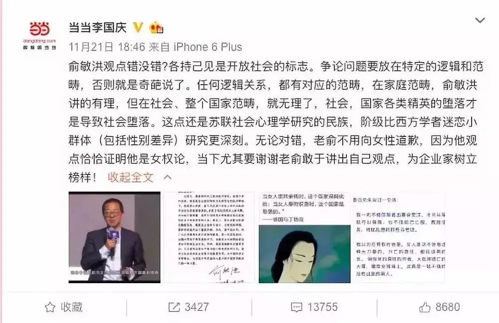 李国庆的表演欲和表达欲,在不久前才发作过一次。在俞敏洪说,“女人的堕落导致了整个国家堕落”引起轩然大波之后,李国庆也在微博上说,“无论对错,老俞不用向女性道歉,因为他观点恰恰证明他是女权论,当下尤其要谢谢老俞敢于讲出自己观点,为企业家树立榜样!”