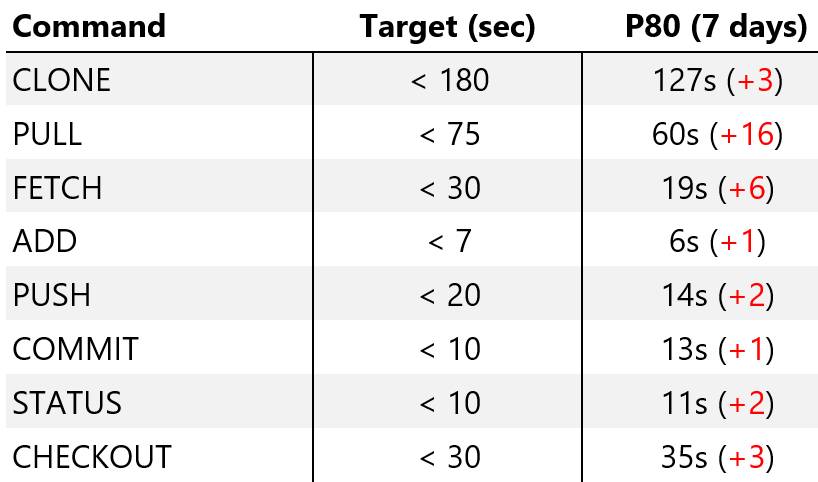 满意度调研也收到了负面反馈,背后的原因有:比如,一些人无法安装 Git 、一些人对学习新知识和接受新事物感到抗拒,但最重要的还是性能问题,我想就此多说几句。 Git 推广时,很多性能还未完善。我们针对 Git 运行的关键性能指数进行检测,以下是日志系统收集的 3500 多位工程师使用 GVFS 的数据。