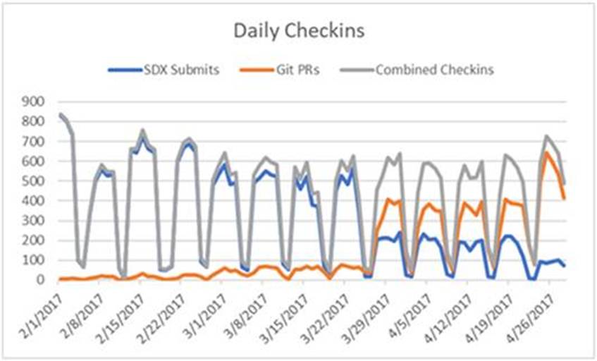 除了调研,我们还通过观察“工程活动”,也就是工程师们是否能顺利完成工作,来判断 Git 的部署成功与否。例如,我们测算了正式分支的“签入”数量,当时,有一半团队还在用 Source Depot,有一半已经迁移到 Git,于是我们观测了两个平台的正式分支的“签入”数量。从下图可以看到 Source Depot 上的签入数出现大幅下降,而 Git 上的合并请求数激增。总体而言,两者的总和保持恒定。我们认为这些数据说明系统运行正常,不存在大的阻碍。