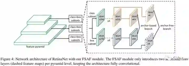 在RetinaNet的基础上,FSAF模块引入了2个额外的卷积层,这两个卷积层各自负责anchor-free分支的分类和回归预测。具体的,在分类子网络中,feature map后面跟着K个3x3的卷积层和sigmoid,在回归子网络中,feature map后面跟着4个3x3的卷积层和ReLU。