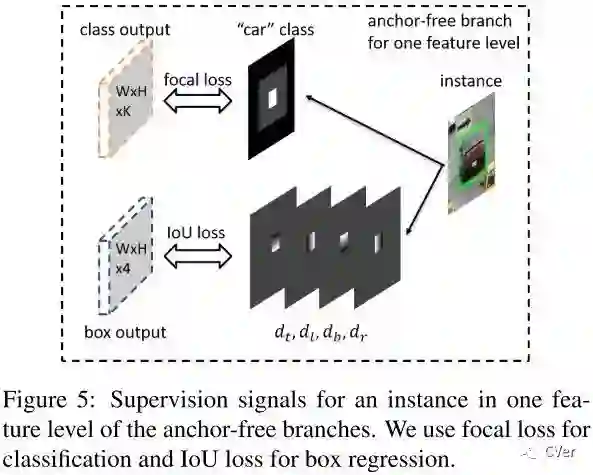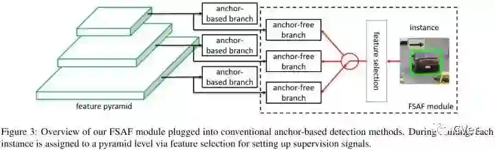 一个anchor-free的分支在每个特征金字塔层构建,独立于anchor-based的分支。和anchor-based分支相似,anchor-free分支由分类子网络和回归子网络。一个实例能够被安排到任意层的anchor-free分支。训练期间,基于实例的信息而不是实例box的尺寸来动态地为每个实例选择最合适的特征层。选择的特征层学会检测安排的实例。推理阶段,FSAF模块和anchor-based分支独立或者联合运行。