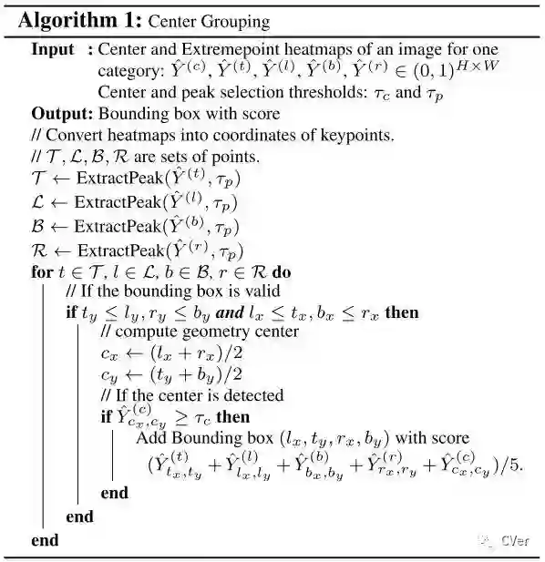 分组算法的输入是每个类的5个heatmaps,一个center heatmap和4个extreme heatmaps,通过检测所有的峰值来提取出5个heatmaps的关键点。给出4个极值点,计算几何中心,如果几何中心在center map上对应高响应,那么这4个极值点为有效检测。作者使用暴力枚举的方式来得到所有有效的4个关键点。