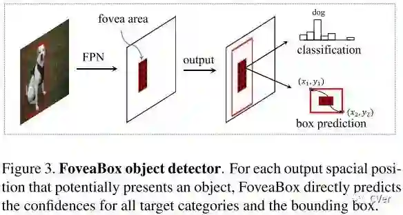 目标的中央凹如上图所示。目标中央凹只编码目标对象存在的概率。为了确定位置,模型要预测每个潜在实例的边界框。