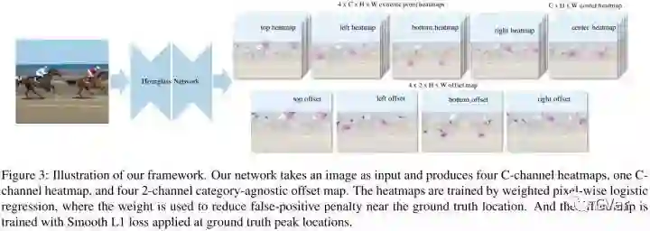作者使用了最佳的关键点估计框架,通过对每个目标类预测4个多峰值的heatmaps来寻找极值点。另外,作者使用每个类center heatmap来预测目标中心。仅通过基于几何的方法来对极值点分组,如果4个极值点的几何中点在center map上对应的分数高于阈值,则这4个极值点分为一组。