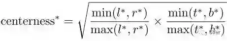 开根号使center-ness衰退缓慢。center-ness范围为0-1之间,通过BCE训练。测试时,最终分数由center-ness预测结果和分类分数乘积得到。