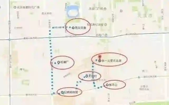 西交民巷—大栅栏—珠市口—琉璃厂—福瑞祥—张一元—内联升—北京坊—纪晓岚故居—琉璃厂文化街