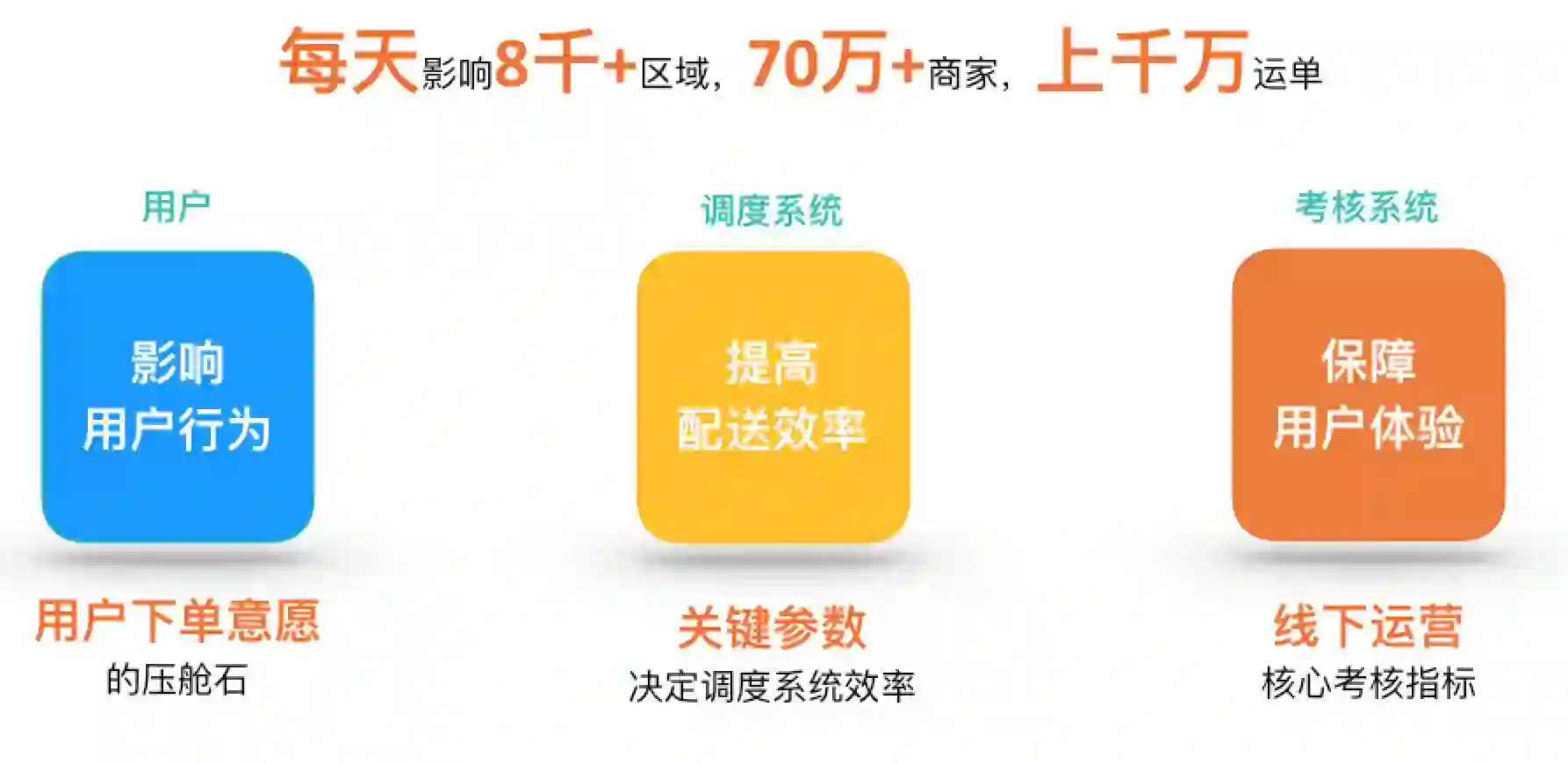 ETA在配送业务架构中也具有重要地位,是配送运单实时调度系统的关键参数。对ETA的准确预估可以提升调度系统的效率,在有限的运力中做到对运单的合理分配。在保障用户体验的同时,对ETA的准确预估也可以帮助线下运营构建有效可行的配送考核指标,保障骑手的体验和收益。