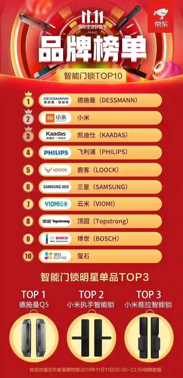 在京东官方正式发布的家装建材TOP10单品榜单中,德施曼、小米作为智能锁品牌纷纷上榜且仅以次于智能马桶盖的成绩分别斩获第二、第三名。