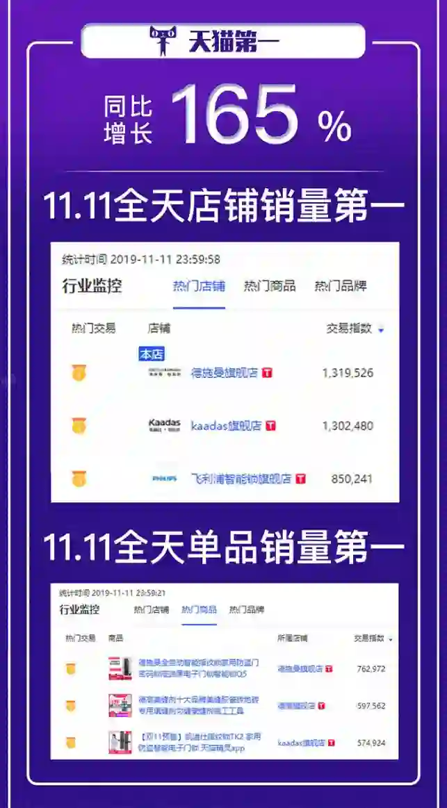 而在天猫平台,德施曼也拿下了智能门锁店铺\单品第一的成绩,同比增长165%。