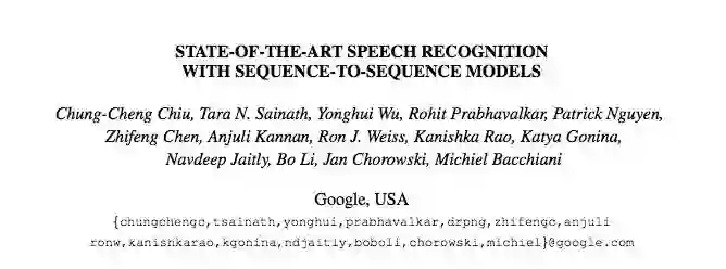 [4] C.C. Chiu, T.N. Sainath, Y. Wu, R. Prabhavalkar, P. Nguyen, Z. Chen, A. Kannan, R.J. Weiss, K. Rao, K. Gonina, N. Jaitly, B. Li, J. Chorowski and M. Bacchiani, “State-of-the-art Speech Recognition With Sequence-to-Sequence Models,” submitted to ICASSP 2018.